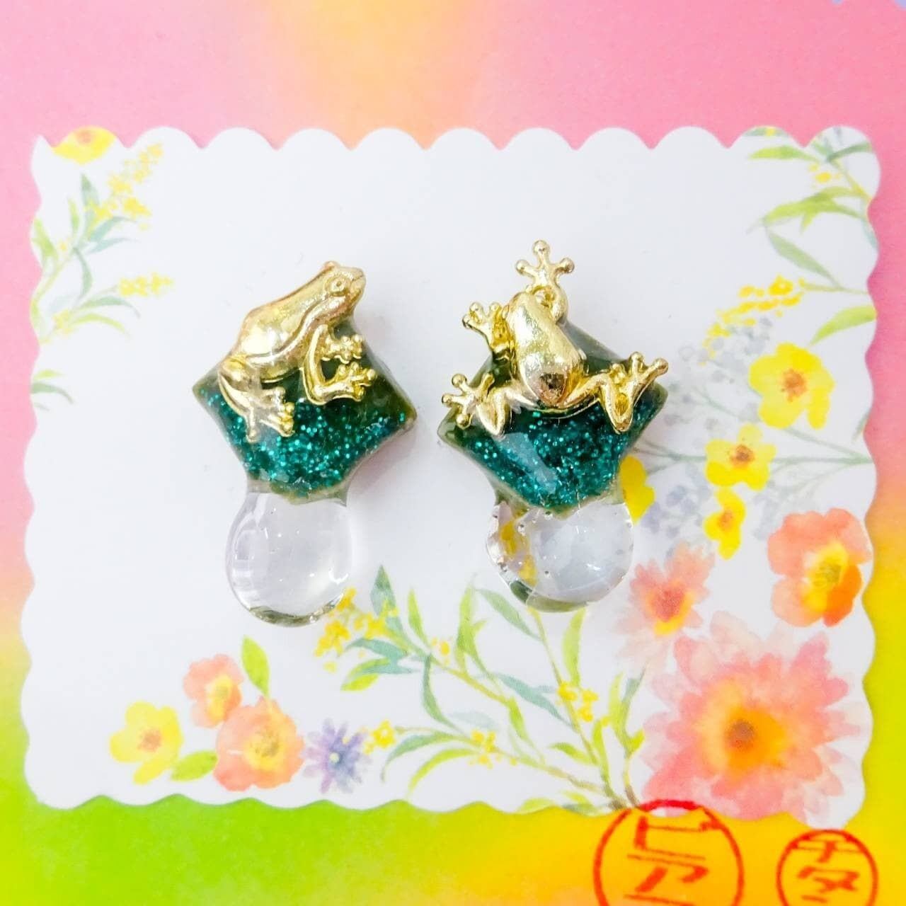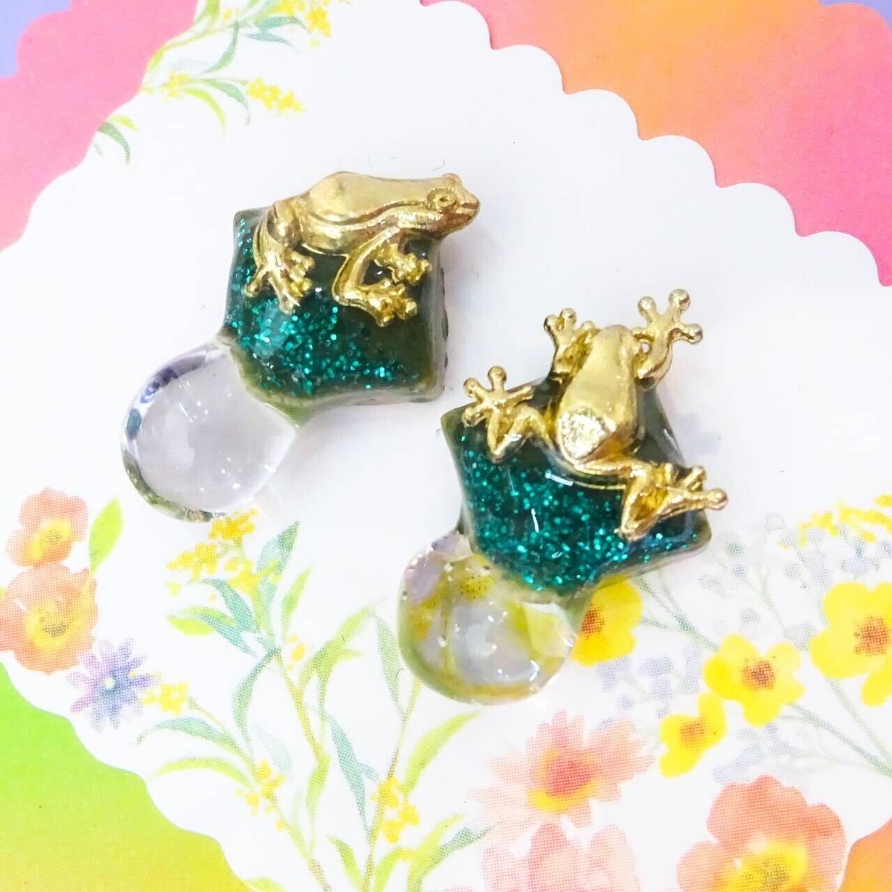 片耳 イヤーカフ 滴り落ちる朝露のカエル 【へばりつきポーズ】 雫 しずく 水滴 水 グリーン ラメ グリッター 生き物