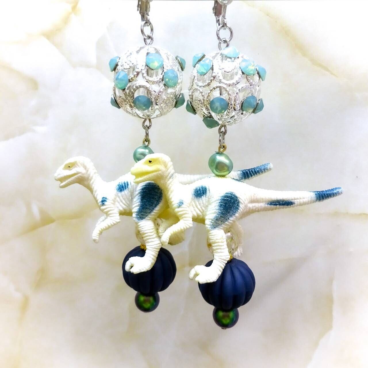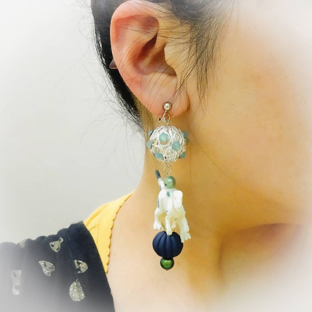 恐竜まわる ミルキーグリーンな ミラーボール 白いダイナソー チタンピアス ダイナソー ザウルス ミラーボール